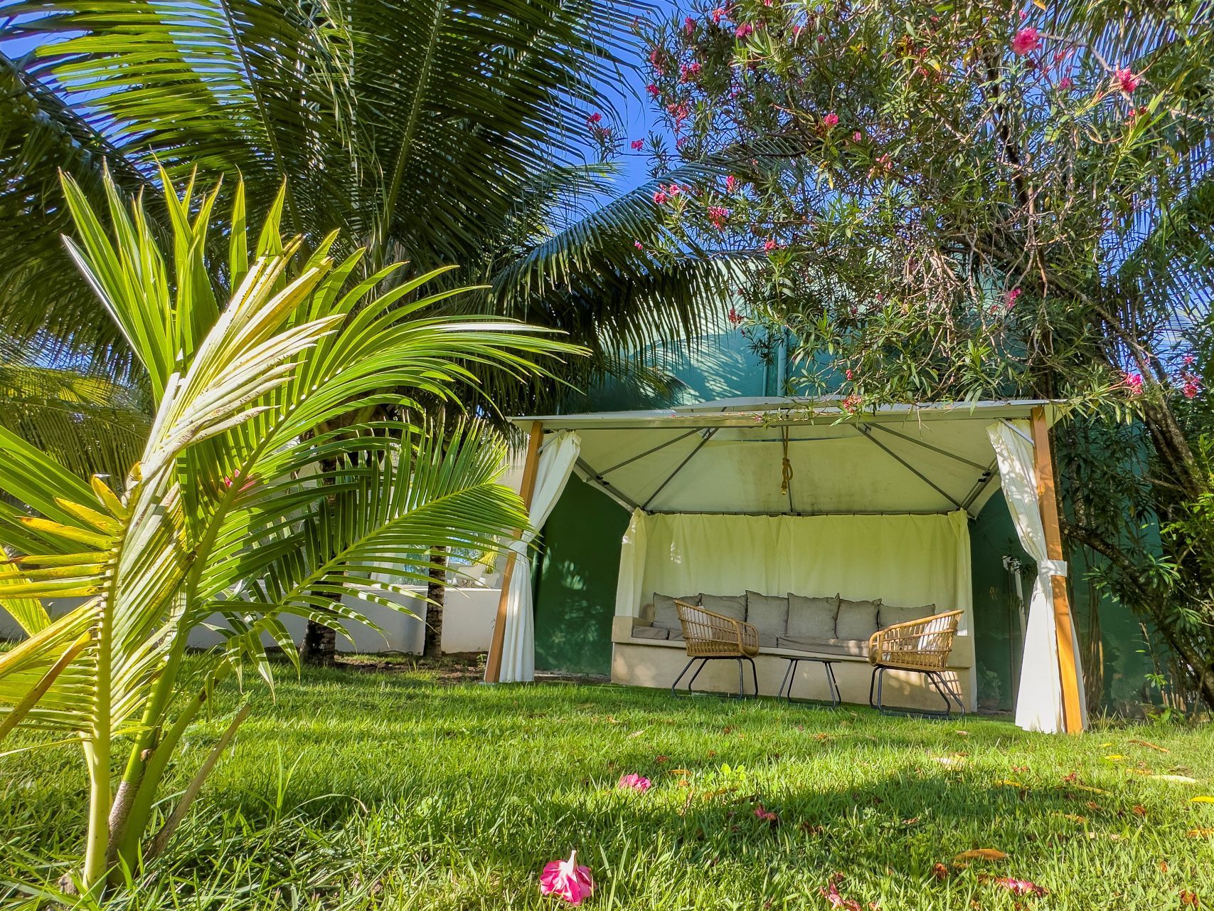 A poucos passos das suítes, um acesso privativo dentro da propriedade conduz à nossa estrutura de praia, proporcionando uma experiência contínua e tranquila à beira-mar.